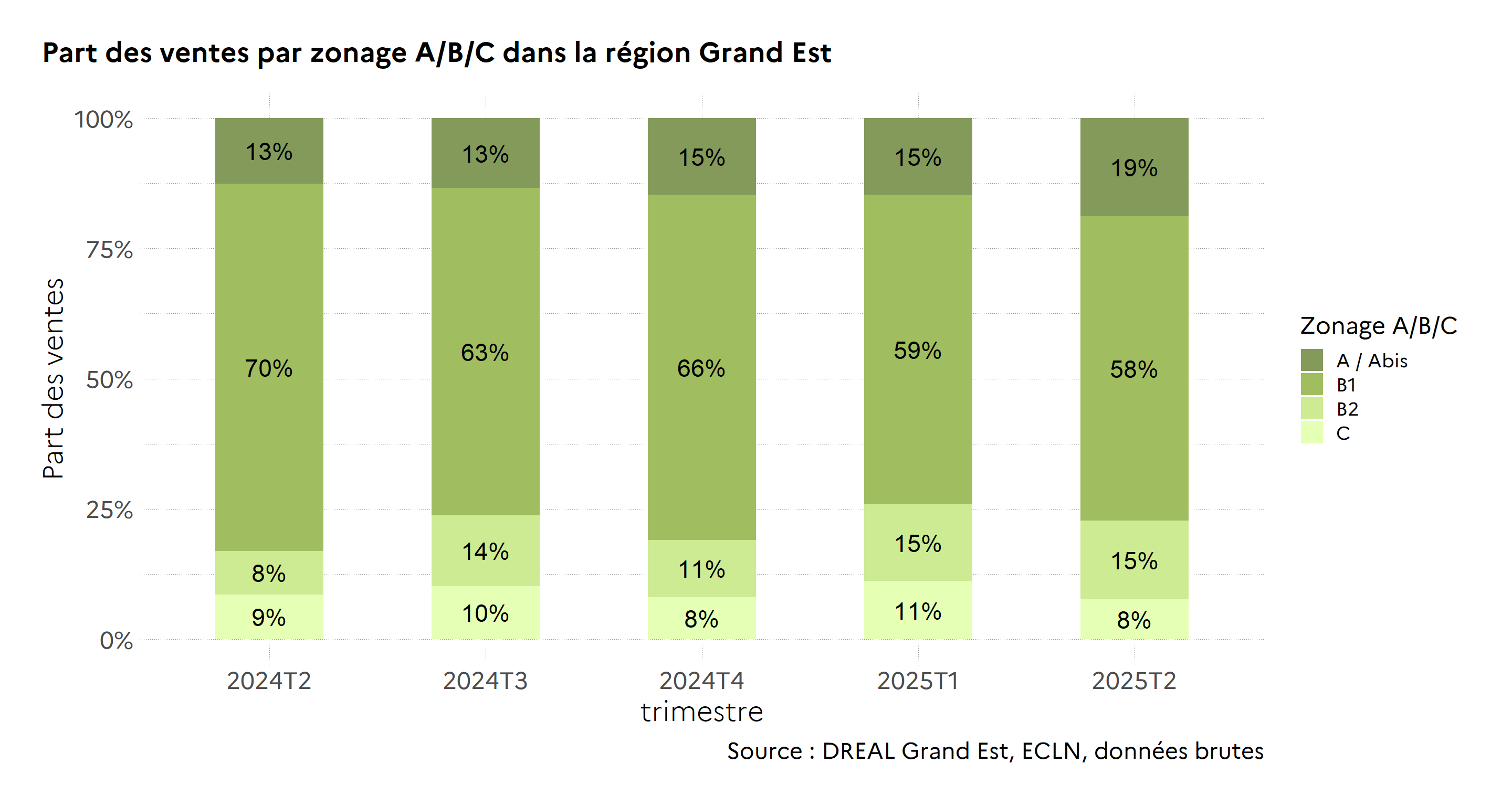 Au 2ème trimestre 2025, 19 % des logements vendus dans la région Grand Est se situent dans les zones très tendues (zone A), valeur en hausse par rapport au 2ème trimestre 2024 (13 %). 58 % des appartements réservés se situent dans les zones où le marché du logement est considéré comme tendu (zone B1). Cette part était de 70 % au 2ème trimestre 2024. 15 % des ventes se situent dans les zones B2, soit 7 points de plus qu’au 2ème trimestre 2024. Enfin, 15 % des ventes sont realisées dans le reste du territoire (zone C).